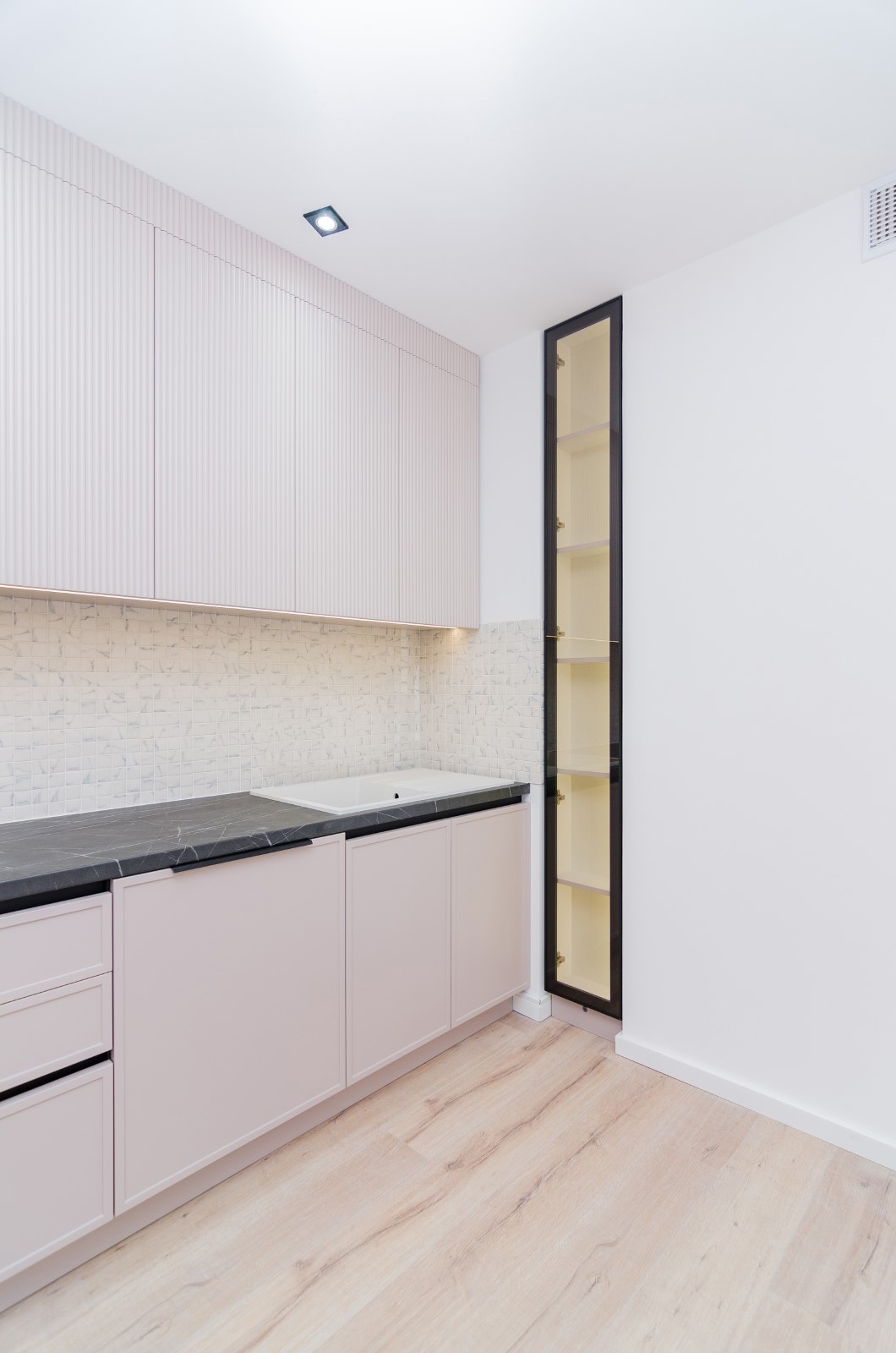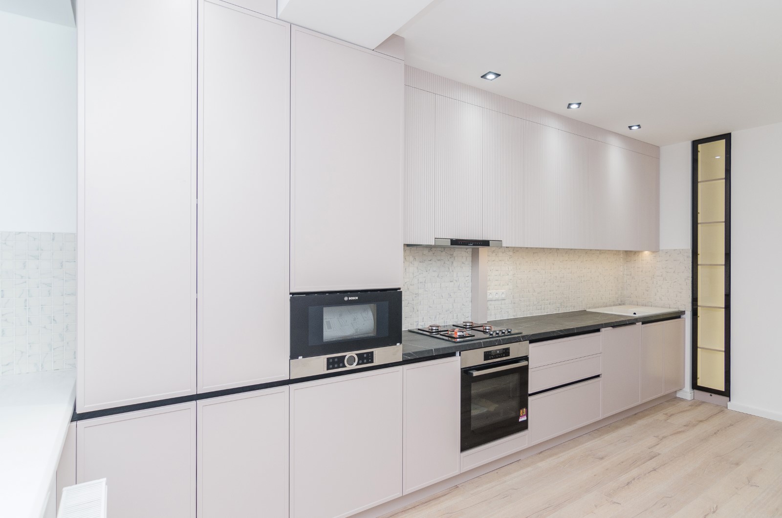 Design modern într-o nuanță nude cu vitrină iluminată