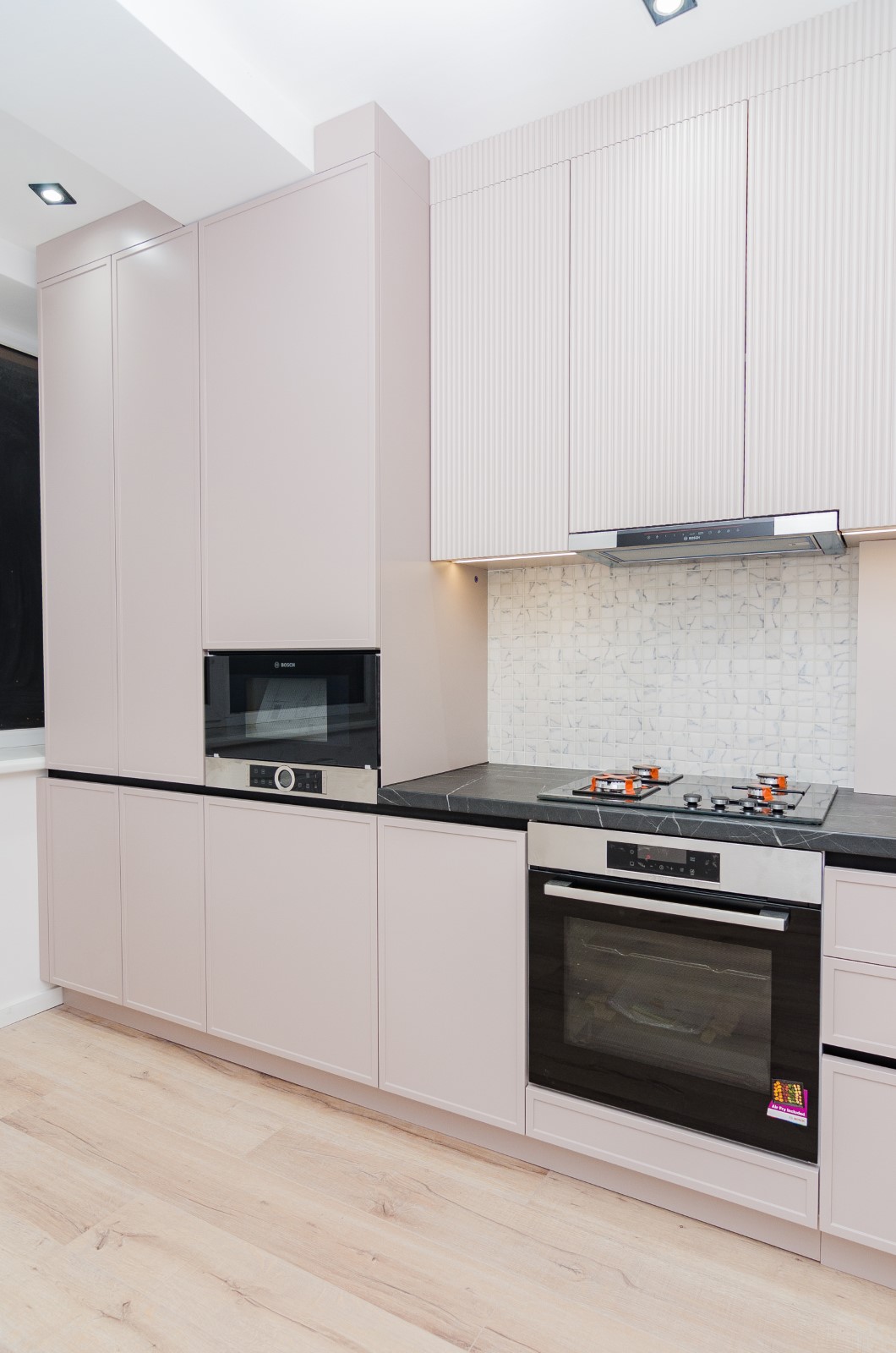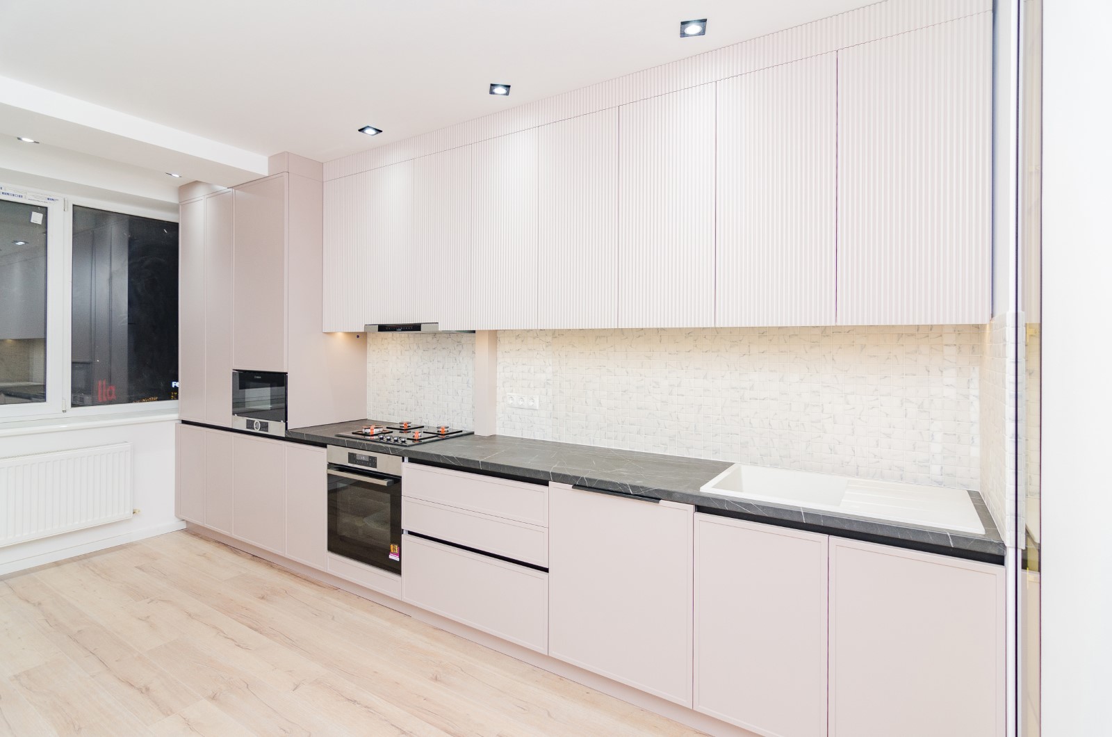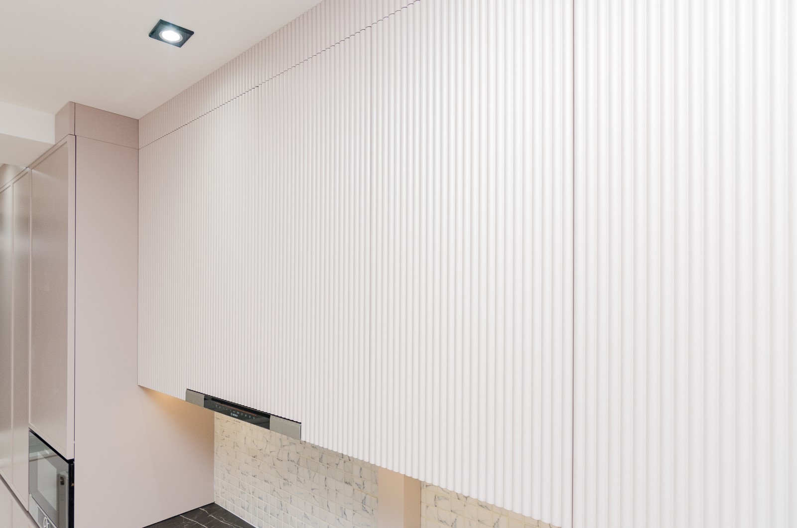 Mobilierul este realizat într-o nuanță deschisă, delicată, care luminează spațiul și creează o senzație de ordine și armonie, iar combinația dintre suprafețele netede și cele striate adaugă profunzime și caracter fără a încărca vizual interiorul.
