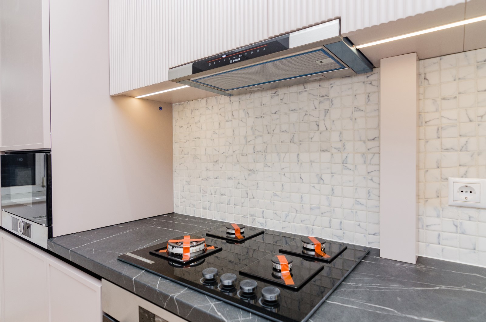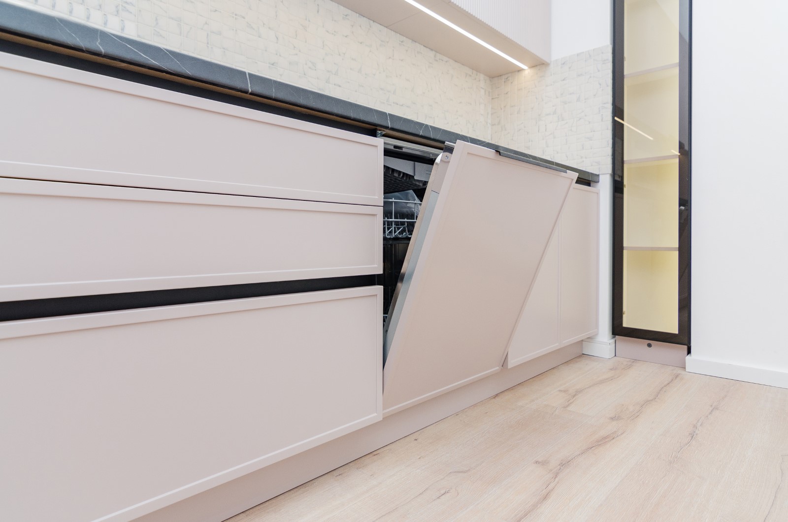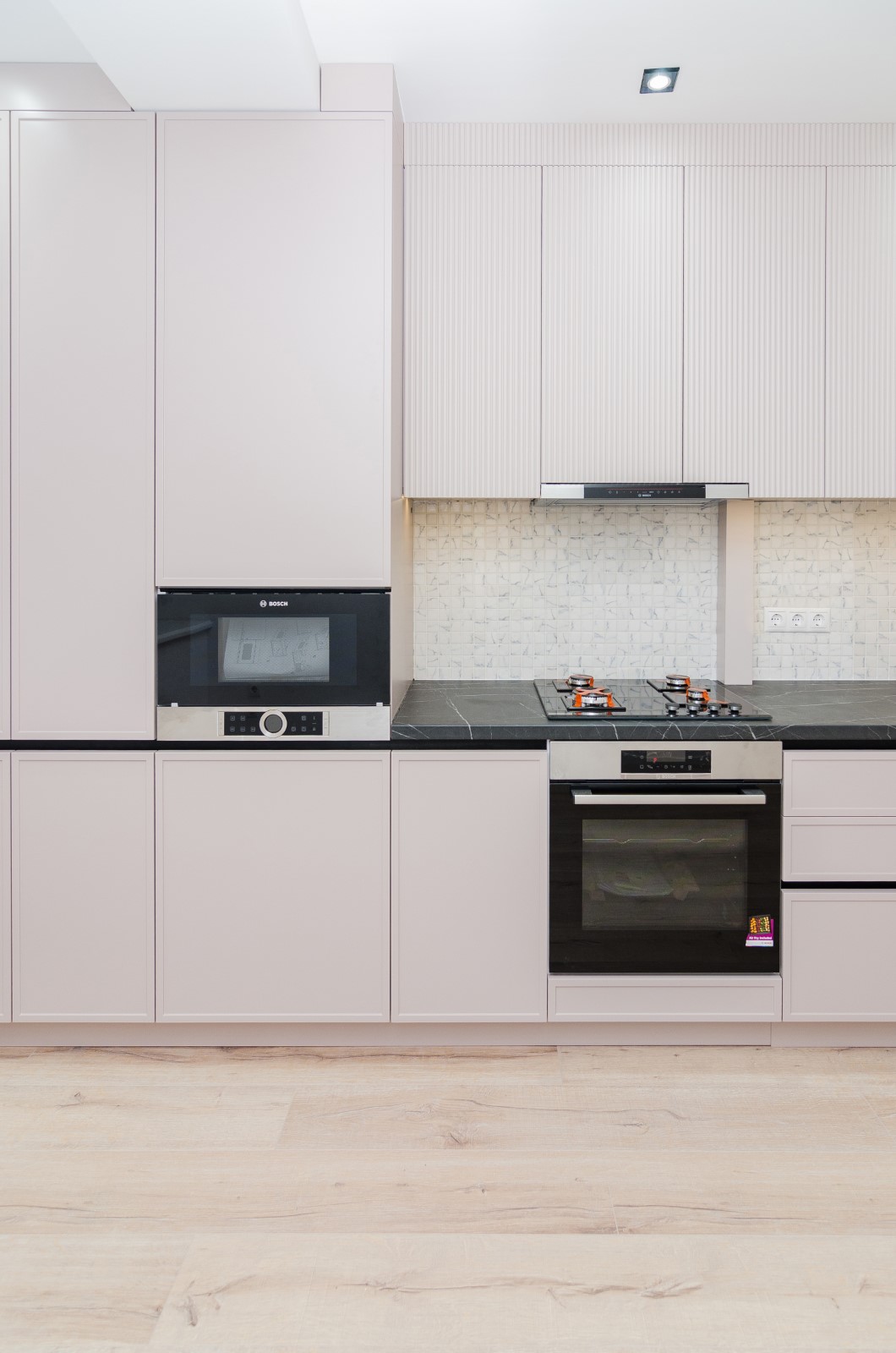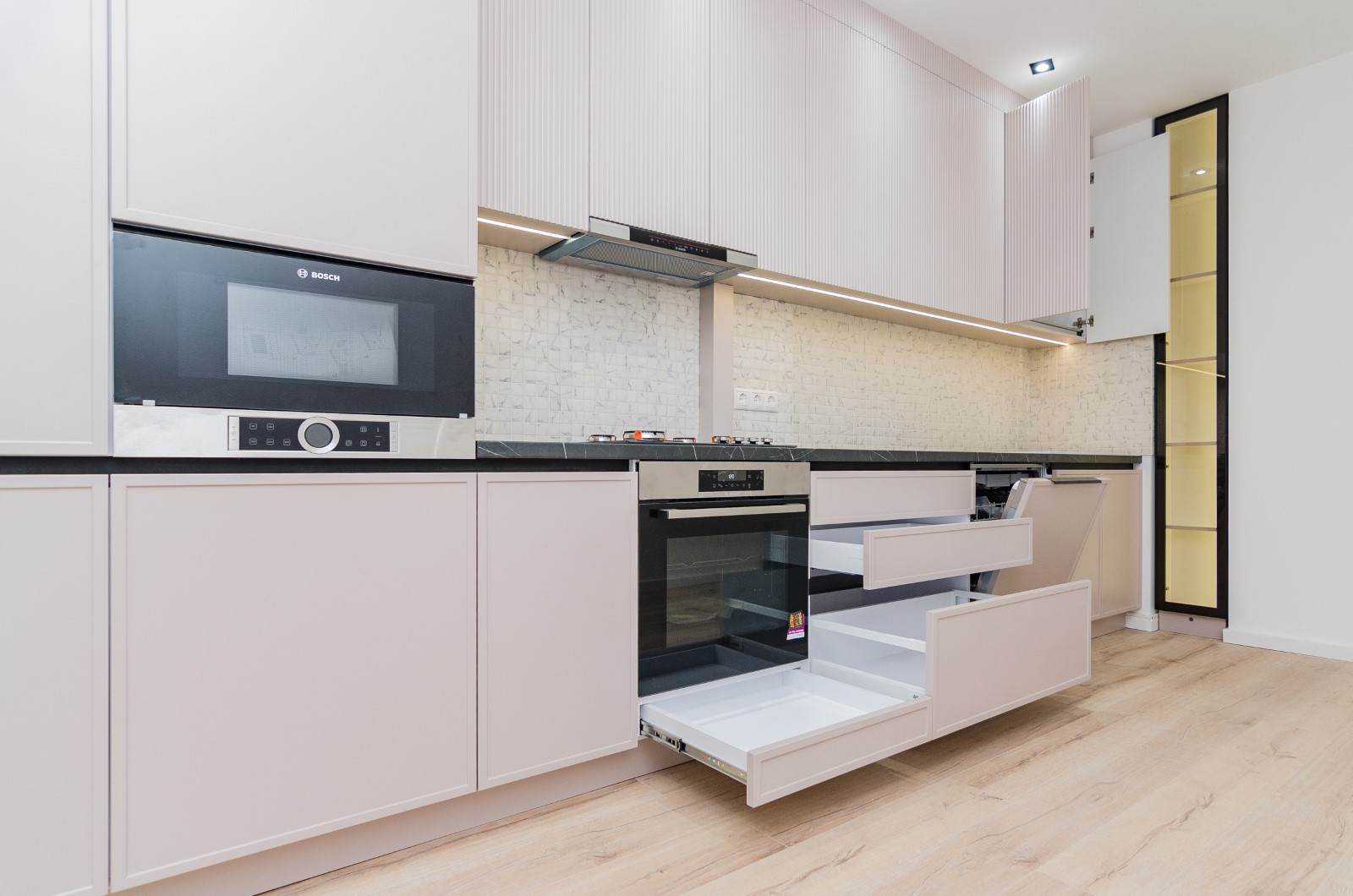 Bucătăria este proiectată pentru a oferi confort maxim în utilizarea zilnică. Sistemele de depozitare sunt bine organizate, zonele de lucru sunt ergonomice, iar modulele sunt amplasate rațional pentru a valorifica eficient spațiul. Mobilierul permite integrarea oricărui tip de electrocasnice moderne — cuptor, plită, mașină de spălat vase, hotă sau alte aparate încorporabile — păstrând un aspect unitar și elegant.