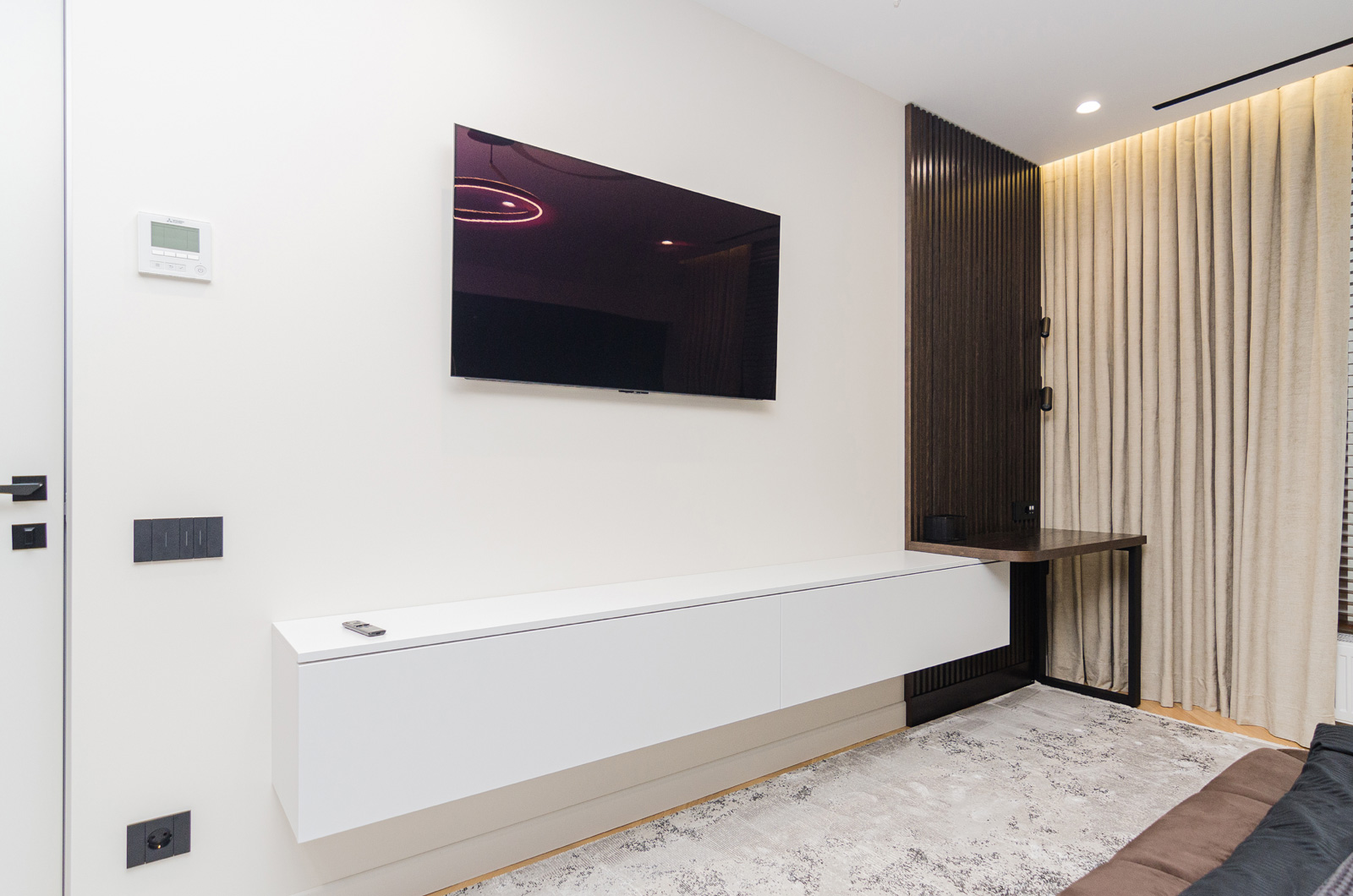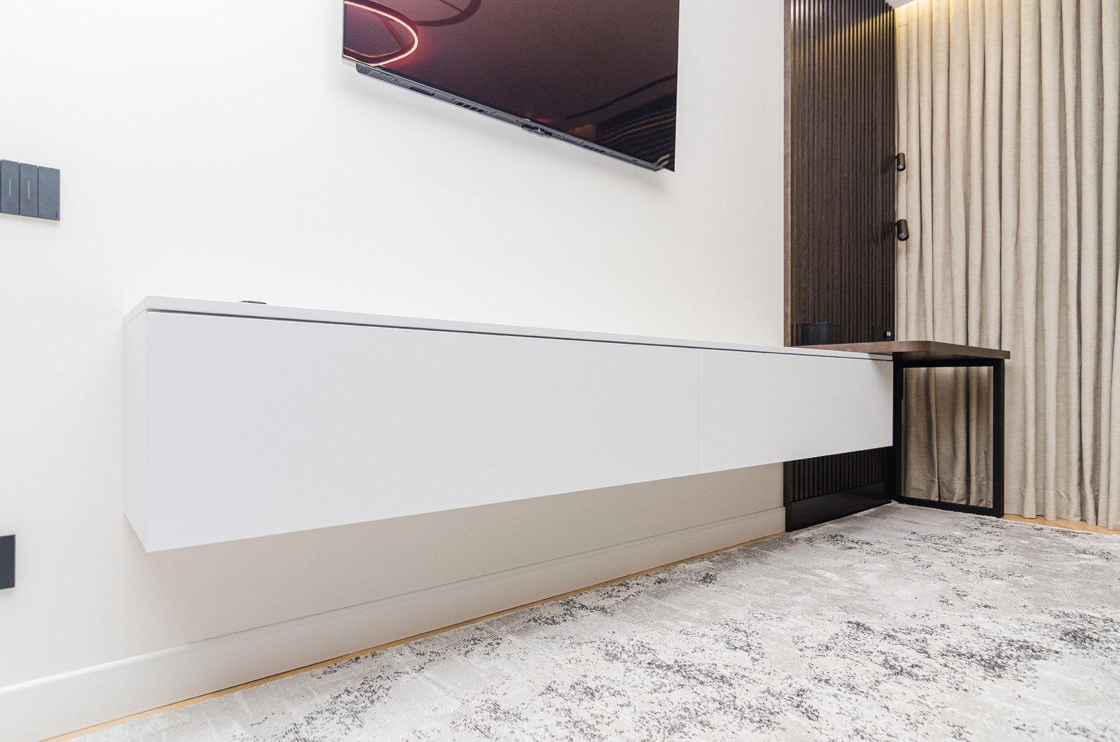 Подвесная тумба-консоль под TV — это продуманное сочетание минималистичного дизайна и практичной функциональности. Изготовленная на заказ, она органично вписывается в современный интерьер и формирует аккуратную, визуально лёгкую TV-зону без перегруженности пространства.